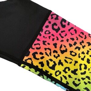 This pair of Zyia Active leggings in size 12 features a fun black base with a rainbow leopard print on one leg, perfect for any activewear occasion. The pull-on closure and high rise waist provide a comfortable and supportive fit for gym training, walking, yoga, running, and jogging.