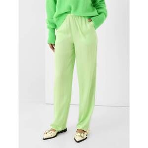 The straight-leg pull-on pant features an elastic waistband, full length, and a straight silhouette. Made from 100% satin acetate fabric, it offers a classic fit. The model is wearing size Small pant and has measurements of 5'8" height, 32A bust, 25.5" waist, 35" hips, and typically wears a US dress size 0-2.