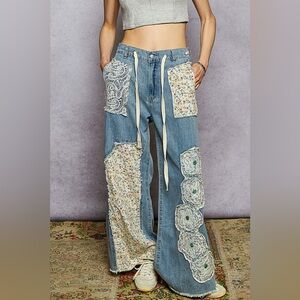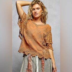 Embrace boho style with this unique top! A whimsical peace sign and lace cutouts give it laid-back charm perfect for a carefree stroll downtown. - Unlined material with a ribbed texture patterned with lace cutouts, and a floral material featuring purple, green, ivory, and yellow hues - A v-cut neckline with a hooded back featuring a functional drawstring - A peace sign design on the front - ¾ length drop sleeves - An oversized silhouette that ends in a straight hemline