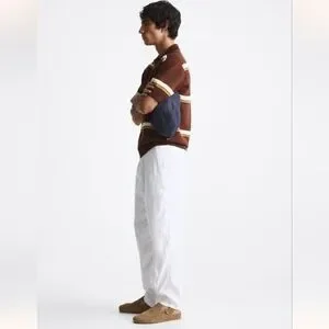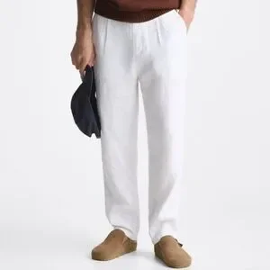 Straight fit pants made of linen fabric. Front pleats at waist. Front pockets and back double welt pockets. Front zip and button closure.