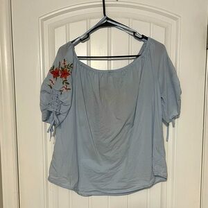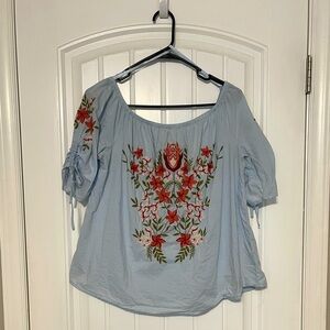 Hinge Off the Shoulder Blue Floral Embroidered Top