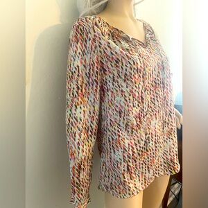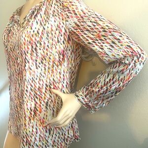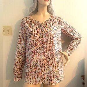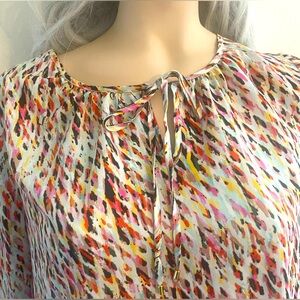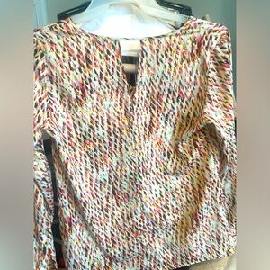 Multi-colored top, thin and flowy but not super stretchy. 100% polyester. Has gold tipped ties in the front. Keyhole back. Sleeves have gold buttons. I wore this mostly for work but it doesn't fit my chest size anymore.