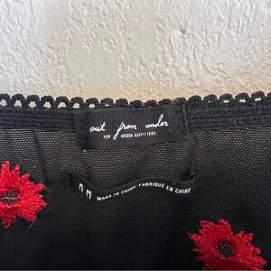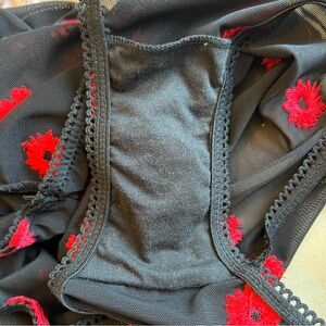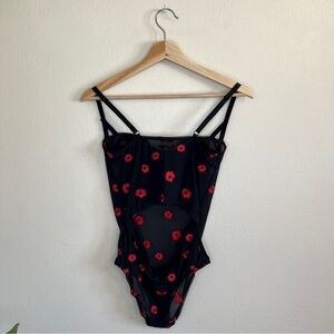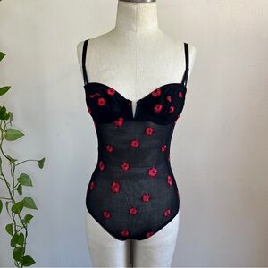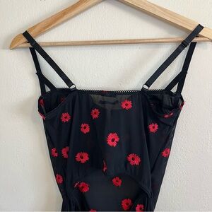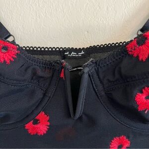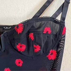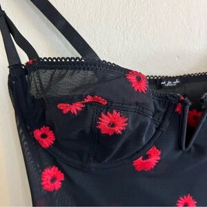 Features underwire cups, adjustable straps, back cutout and all over floral embroidery.