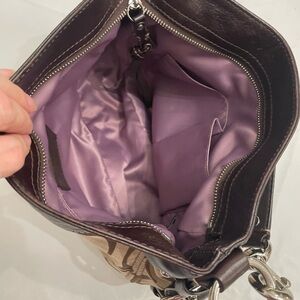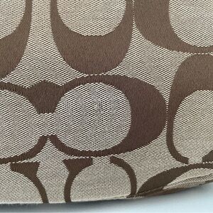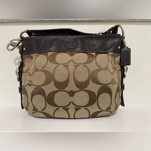 Coach Zoe Signature Hobo bag ,Leather,Canvas,Silver Hardware interior 1 zip pocket and 2 slip pocket,light wear tiny spot ,Measure 14”Lx5”Wx12”H top zip pocket,interior 1 zip pocket and 2 slip pockets