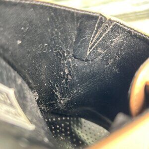 Nice condition but the lining on both sandals is cracking and flaking off. Any props shown in the photos are not included. The colors you see in the photos may vary depending on your computer screen and the lighting. I do lightly clean the shoes with products including disinfecting wipes but there may still be wear and stains showing.
