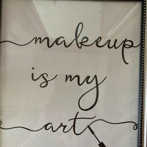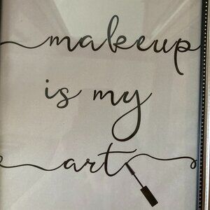 Framed piece of wall art that says "Makeup is My Art." Fashionable, silver colored frame. Has glass in the frame.