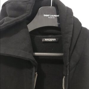Like new, BALMAIN, classic black zip-up hoodie with lots of silver zippers at front, back, and sleeves. One of last designs by Christian Decarnin during his final season at Balmain. Only worn a couple times. Like new condition. Measurements when lying flat: Chest 20"; Waist 20"; Hips 20"; Sleeves 28" from top of shoulder; Length in Front 24.5"; and Length in back from bottom of hood to hem 30".