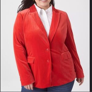 Lane Bryant Red Velvet Two Button Stretch Blazer Size 24. Gently worn in excellent condition. Underarm to underarm measures 26 inches and length is 29 inches.