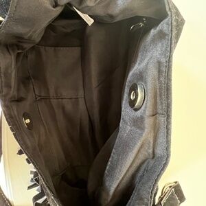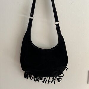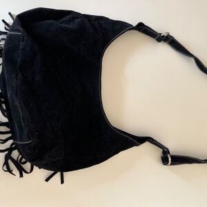 Black Suede purse with fringe accents and zip interior pocket. Only used a couple of times. Magnetic snap closure. Purse has stitching all along purse.