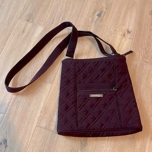 2 Outside zip pockets, 3 open pockets on inside, adjustable shoulder strap.