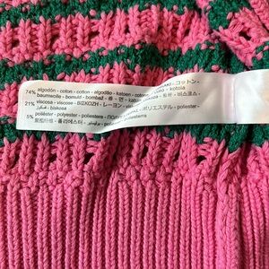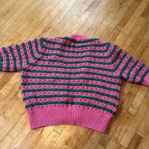 Pink and green crochet style sweater. Can wear open hanging or buttoned up. Reminds me of a watermelon. Worn once and in excellent condition.