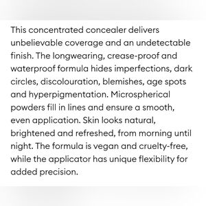 A full coverage, weightless, waterproof concealer with innovative microspherical powders that blur and brighten for up to 16 hours of instant skin perfection.