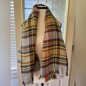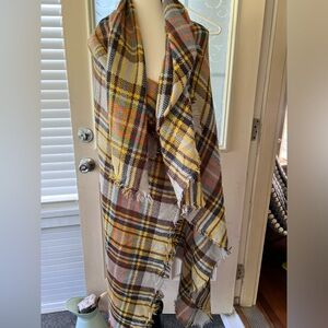 This scarf is large and can be worn several ways. It feels soft and is very colorful. Plaid blue, brown, gold, green with fringe. Perfect for lounging or to throw on at the office or running errands.