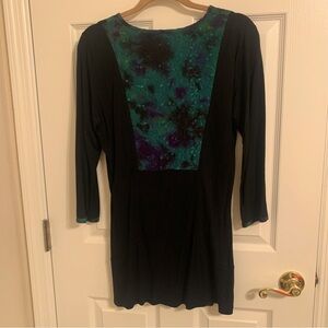 Sophisticated coloring of black with green vine design accent on front, back, and cuffs. Side slit detail. Slight flair at the bottom. Great to dress up or down with jeans, black pants, or leggings. Lightweight rayon material.