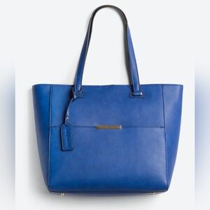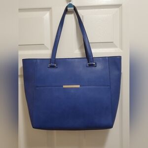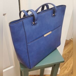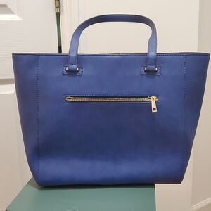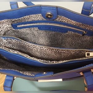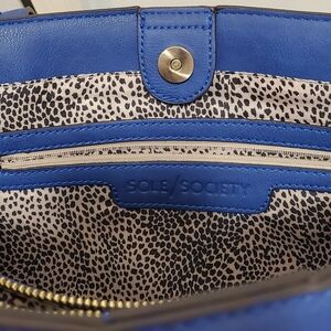 Sole Society "Becca" tote. Cobalt blue (brighter than navy blue). Faux leather. Very roomy, zip closure and the center zip compartment is padded, there are other compartments as well. Gold metallic details and fun animal print lining. 2 exterior pockets, one zipped, the other magnetic closure. Little gold nub feet on bottom for protection. Measurements approximately 12.8x11.8x3. Excellent condition.