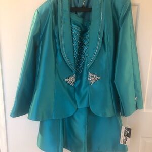Magnificent Emily Mint Green Skirt Set: Jacket and Set-On Waist Skirt with Back Zipper. Size 32W. Lined. Pearlized Jewel Accents Around Neck and on Sleeves. 6 Pleats in Kick Pleat at Back. In Good Condition. If you are sincerely interested, I will Dry Clean before you Purchase, and retake pictures. Please read description, look at pictures closely for any issues, and ask questions before purchasing.