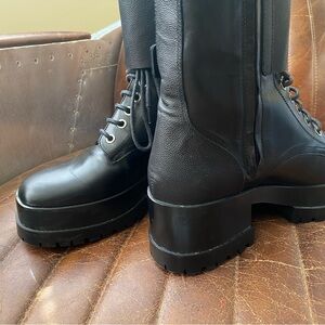 Robert Clergerie calf leather combat boot with textured trim. 1.8" block heel with platform. Round toe, lace-up vamp, double monk strap at upper. Side zip eases dress. Leather upper and lining, rubber outsole