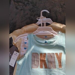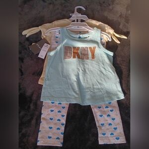 DKNY 3pc infant girl pantset. Comes with 2 shirts and 1 pair of Leggings. Size 24M.