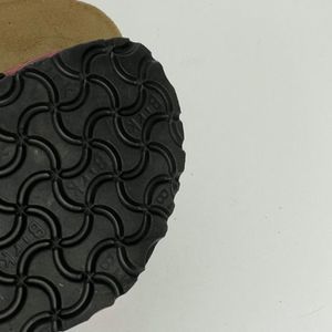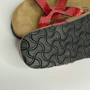 Birkenstocks red snakeprint sandals in size women's 6, men's 4. Narrow width. Some marks on insoles, see pics, marker on soles. Leather uppers.