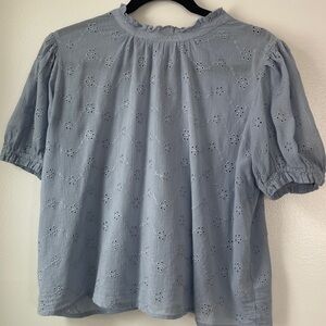 Kensie Jeans denim top with black tie around neck sizeL. Ruffle around neck and cuff of sleeves.