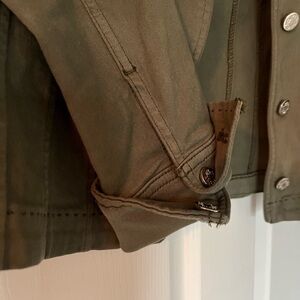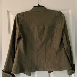 Army green cotton blazer. Perfect business-casual piece. Rouching detail at shoulders, with removable shoulder pads. Blazer has nice stretch and nice form.