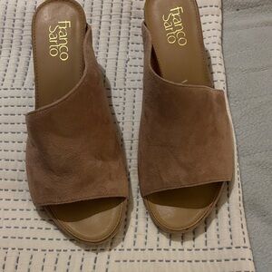 Mix Mooz candles. Size 7 1/2. Leather and some type of material. Very cute. Tan with brown leather straps. In good condition.