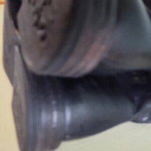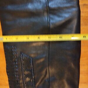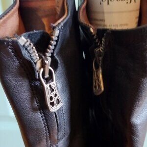 These boots are amazing. You can smell the quality in the leather when you open the box, and it feels buttery soft. The detailing is exquisite - black leather with burgundy details. Patches of finely detailed leather that look like gills. Weathered silver studs, partial side and working partial back zippers. Rounded toe. 1" heel. Measures 18.5" from top of boot to top of heel. Calf is 15".