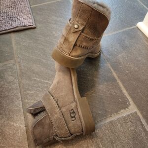 patent leather with signs of love and wear. marks on the leather and buckles. these are an ombre fade of gray to black. one of my faves but time to let them go. great for rainy days. size 6. buckles at ankle for detail and calf can adjust fit.