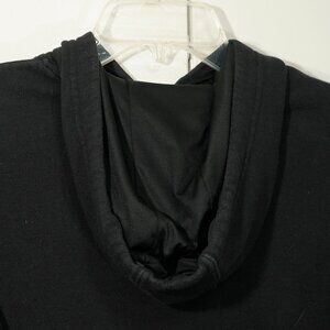 Adidas Black Three Stripe Hoodie Minimalist Street Wear Athletic Pullover Top, size small. This is a black three stripe hoodie with a lined hood that has a minimalist 70s street wear aesthetic.