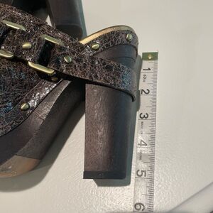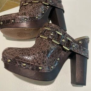 EUC. Well maintained chocolate brown mules with gold accents. Very little wear. Heel height 5”. Front platform height 1.25”.
