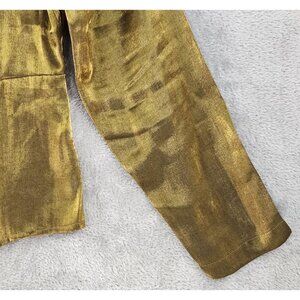 Cool & comfortable women's gold, metallic, button up, long sleeve shirt. Gently used, vintage, in good condition. 77% Rayon 23% Polyester Dry Clean Please don't hesitate to visit my store for matching items. Same or next day shipping!!! Please view all photos for flaws & exact measurements that may differ from tags.