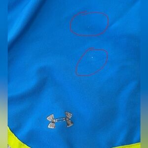 I’ve just posted more pics of these shorts. There are two tiny white dots in the front near the U emblem. I’ve circled those. The U emblem is faded. There are no tears or any other stains. Please see the photo of the white dots.
