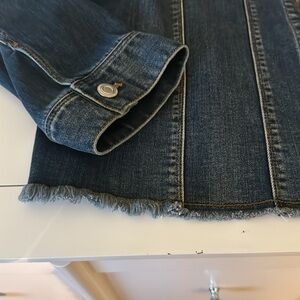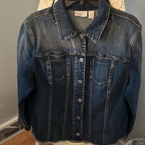 Chico’s sz 3 denim jacket with two top pockets and raw hem at the bottom. Soft denim with a little stretch 72% cotton 27% polyester 1% spandex