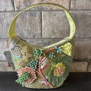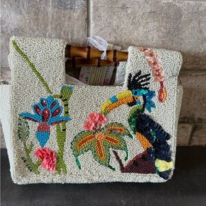 True red and straw. Still in plastic. Crossbody strap included. Middle zip compartment and two side openings. Medium size gorgeous Reed satchel.