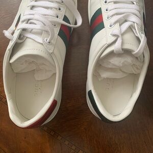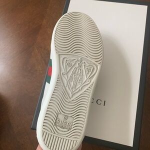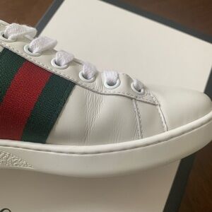 The House's classic low-top sneaker is embellished with the gold embroidered bee against the green and red Web. The bee is an archival code first introduced in Gucci ready-to-wear in the 1970s.