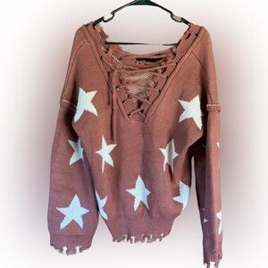 NWOT POL Distressed Pink and Cream Star Sweater S