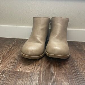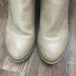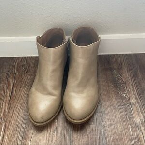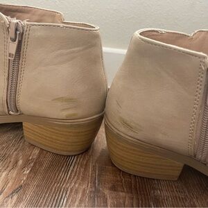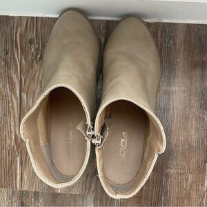 Soda women’s mug round toe brown tan faux leather fall western ankle bootie shoes size 6.5. Heel is about 1.5in tall. Inner side zipper. Creasing around the toes and scuffing on both heels (see 3rd to last pic). Also has a small black dot on the right one near the ankle (see last pic). Still in good condition. Smoke free and dog friendly home!