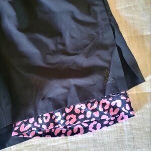 Black with pink pattern under layer that includes pocket on inside right leg plus 2 regular pockets and a small zipped pocket on the very back