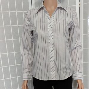 Worthington stretch blouse with ruched (gathered) sleeves. The white chain pattern adds a little fun to this basic top. Stretchy material 95% polyester 5% spandex.