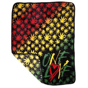 A Marley inspired design showing the words One Love and rasta colored pot leaves all on a black colored background. This super soft, fuzzy throw is manufactured from recycled fibers making it not only functional, but earth-friendly, too. The outer edge is surrounded in a thick fleece binding that is double seemed for durability. We know that you will love your new throw, thanks for reading.