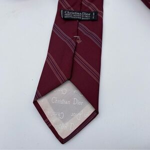 Elevate your style with this vintage Christian Dior tie. Made with a luxurious polyester and silk blend, this striped tie features an embroidered logo accent and a classic width. The burgundy red color adds a touch of sophistication to any outfit, making it perfect for a preppy or designer look. This tie is a must-have for any fashion-forward man looking to add a touch of luxury to their wardrobe. The Dior brand is synonymous with quality and style, making this tie a great addition to any collection.