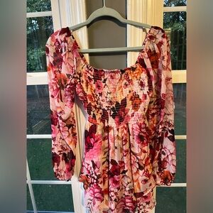 • Floral print; Smocked bodice; Ruffle overlay; Lined