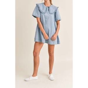 This Gabi Ruffle Collar Swing Dress is crafted from soft, textured denim with a Peter Pan ruffle collar and a chic shift silhouette. Featuring short sleeves and a zip closure, it offers a stylish and comfortable fit for both casual and evening wear.