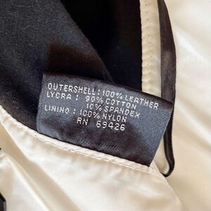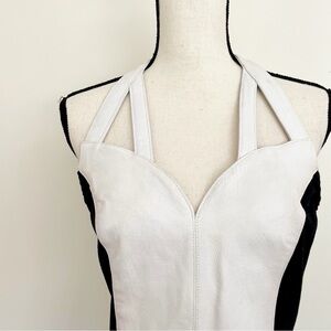 Vintage 90s Leather Paneled Moto Halter Dress. Bodycon dress with caged straps and sweetheart neckline. Pointed waist with paneling. Adjustable snap closure on halter straps. Zipper closure down the back. Partially lined—leather is lined with nylon. Brand is “Wilsons: The Leather Experts.” White panels are 100% leather; black panels are 90% cotton, 10% spandex. Dry clean only. Good vintage condition: some wear on leather but no cracking. Vintage size large, but please refer to measurements: 32” chest, 29” waist, 36” hips, 36” length. Has stretch due to black panels.