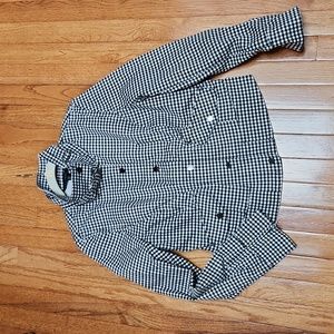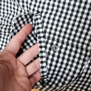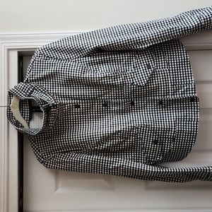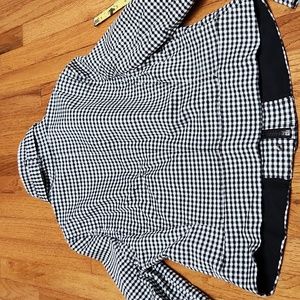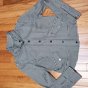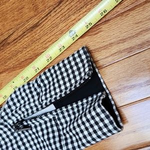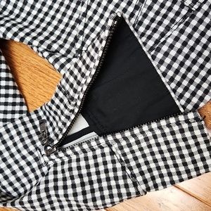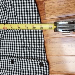 White House Black Market moto jacket. Black and white checkered houndstooth print. Zip and snap front. Black hardware. Buckle at neck. Zip at wrists. 2 front pockets. Size 12. See measurements. Marking is on i side and not visible when worn. Stretchy. No rips.