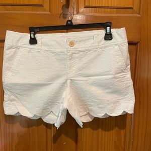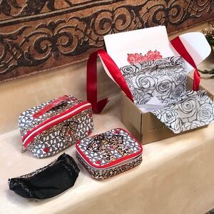 Curved front pocket, zippered back pocket, inner zip pocket, inner slip pocket, expanding zipper. 8.7” x 10.6” X 1.4”. Quality leather. Used once. Like new. Navy blue w/rose gold accents.
