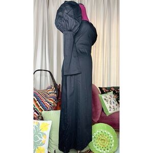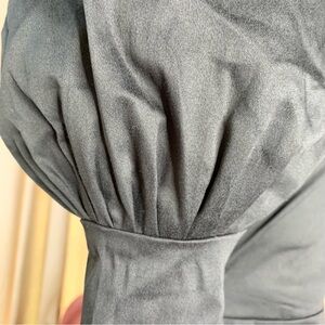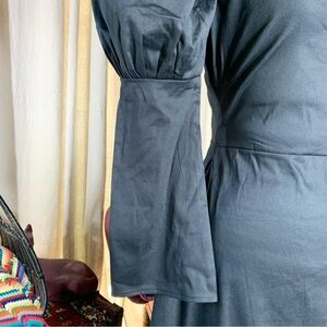 Olivia Rose the Label “Ophelia” dress. A real statement piece, not your average LBD. Dramatic puff sleeves with pin tucks and a slight bell cuff or Juliet sleeve. Square neckline and fitted bodice, flairs wide at the hip. Black fabric feels like a cotton blend with slight stretch. Midi or tea length hem