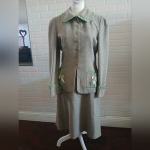 Girls classic creamy light yellow dress with green edging around cuffs and Peter pan collar. Three button closure in back and embroidered sunflower design on front.