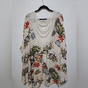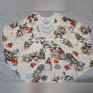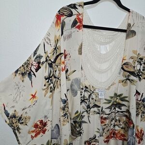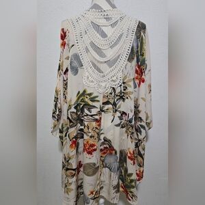 Beautiful flowy tropical floral print kimono swim coverup with crochet lace detail in the back. The length of the kimono is shorter in front and longer in back.