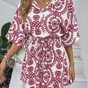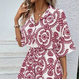 Pink Boho Ladies' Printed Leisure Vacation Batwing Sleeve Belted Romper